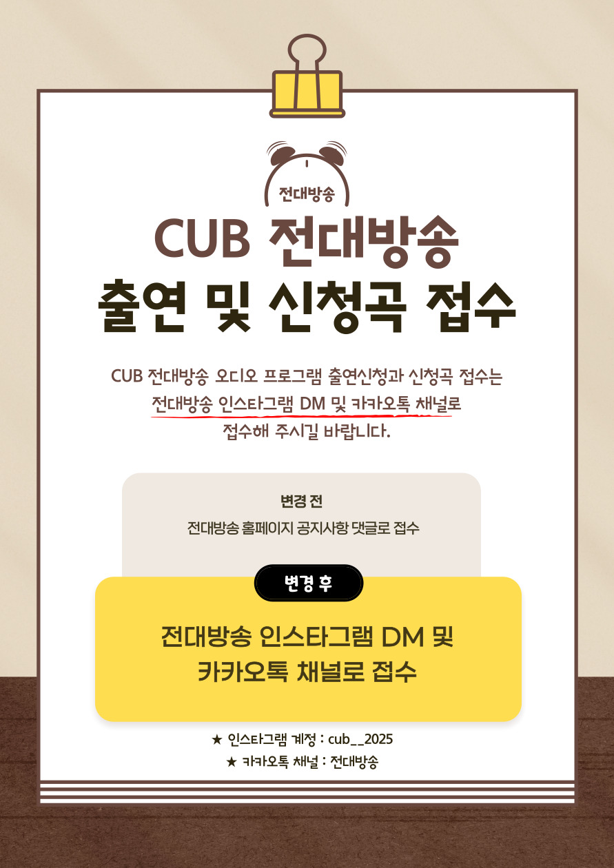 CUB 전대방송 공식 인스타그램 DM과 카카오톡 채널 접수로 변경됐습니다.