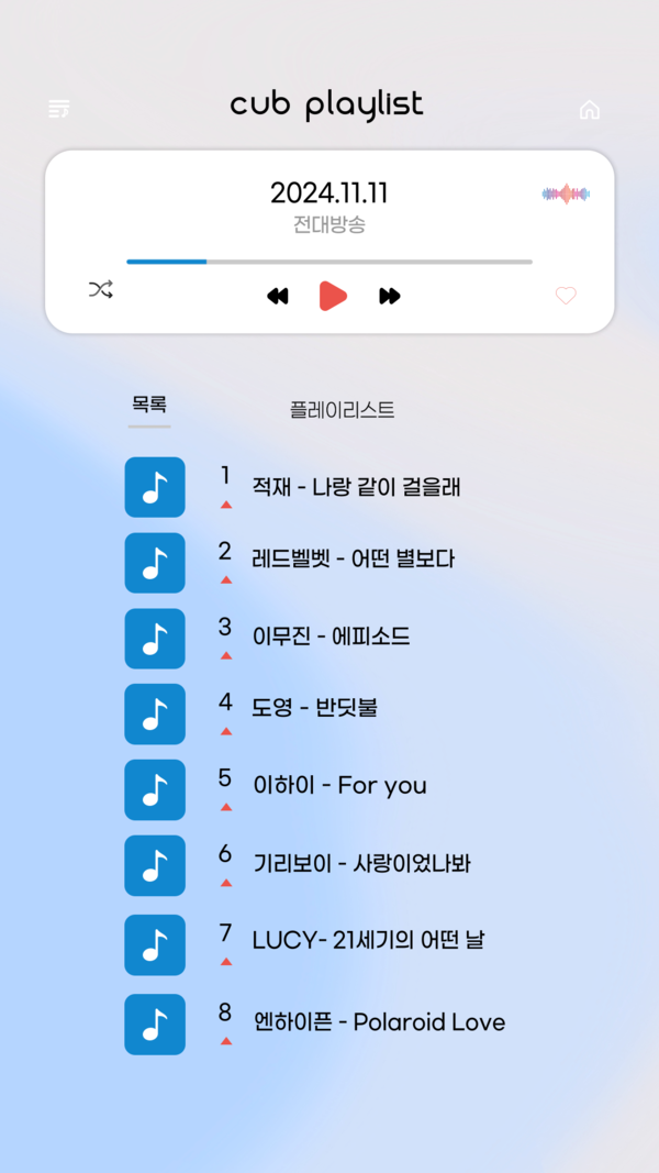 현재위치 홈 AUDIO 광주 캠퍼스 김예린 PD gyelin7@gmail.com 입력 2024.11.11 11:36 바로가기 복사하기 다른 공유 찾기 기사저장 글씨크기 본문 글씨 키우기 본문 글씨 줄이기 이 기사를 공유합니다 페이스북(으)로 기사보내기 트위터(으)로 기사보내기 URL복사(으)로 기사보내기 닫기